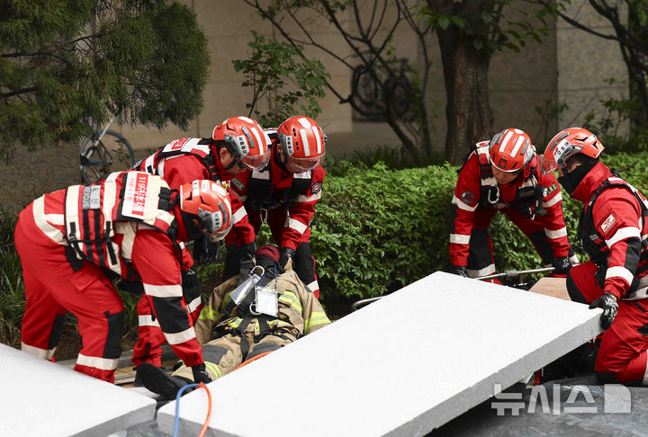 [서울=뉴시스] 김근수 기자 = 23일 서울 용산구 래미안 첼리투스에서 진행된 고층빌딩 재난대응 안전한국훈련에서 소방대원들이 건물붕괴 상황에 가장한 훈련을 하고 있다. 2025.05.23. [email protected]