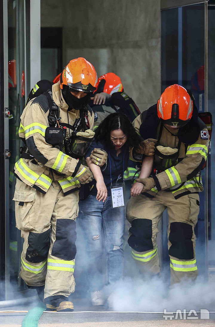 [서울=뉴시스] 김근수 기자 = 23일 서울 용산구 래미안 첼리투스에서 진행된 고층빌딩 재난대응 안전한국훈련에서 소방대원들이 화재상황을 가장한 훈련을 하고 있다. 2025.05.23. [email protected]