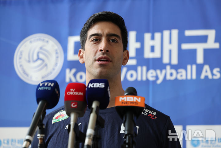 [진천=뉴시스] 황준선 기자 = 이사나예 라미레스 대한민국 남자 배구 국가대표팀 감독이 23일 오후 충북 진천군 진천국가대표선수촌에서 열린 대한민국 배구 국가대표팀 공개훈련에서 취재진과 인터뷰를 하고 있다. 2025.05.23. [email protected]