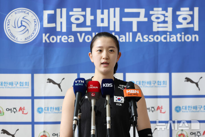 [진천=뉴시스] 황준선 기자 = 대한민국 여자 배구 국가대표팀 이다현이 23일 오후 충북 진천군 진천국가대표선수촌에서 열린 대한민국 배구 국가대표팀 공개훈련에서 취재진과 인터뷰를 하고 있다. 2025.05.23. [email protected]
