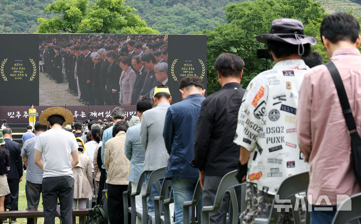 [김해=뉴시스] 차용현 기자 = 23일 경남 김해시 진영읍 봉하마을에서 열린 고 노무현 전 대통령 16주기 추도식에서 권양숙 여사와 문재인 전 대통령 부부 들 참석자들이 묵념하고 있다. (공동취재) 2025.05.23. [email protected]