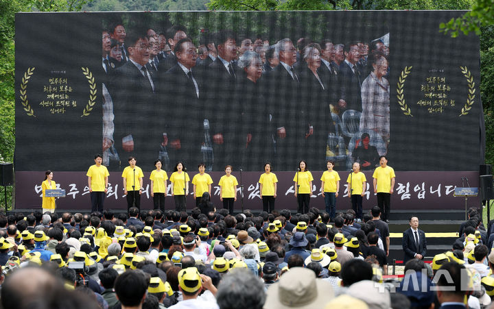 [김해=뉴시스] 차용현 기자 = 23일 경남 김해시 진영읍 봉하마을에서 열린 고 노무현 전 대통령 16주기 추도식에서 권양숙 여사와 문재인 전 대통령 부부 들이 애국가를 제창하고 있다. (공동취재) 2025.05.23. [email protected]
