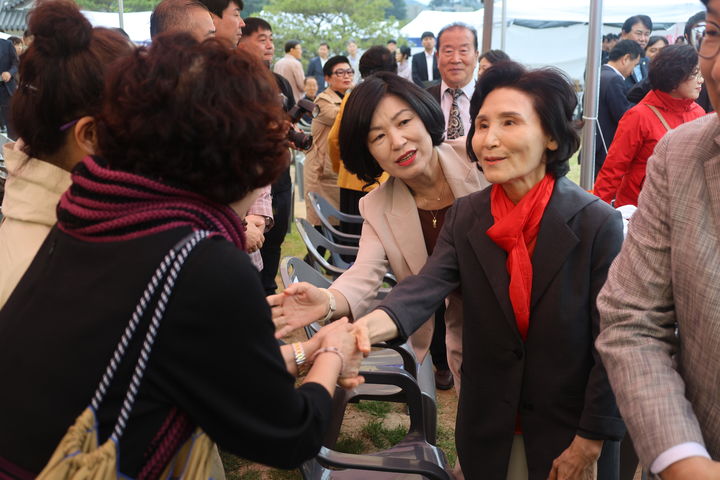 [서울=뉴시스] 고승민 기자 = 김문수 국민의힘 대선 후보의 부인 설난영 여사가 23일 차문화축제가 열린 강원 강릉 오죽한옥마을을 방문, 시민들과 인사를 하고 있다. (사진=국민의힘 제공) 2025.05.23. [email protected] *재판매 및 DB 금지