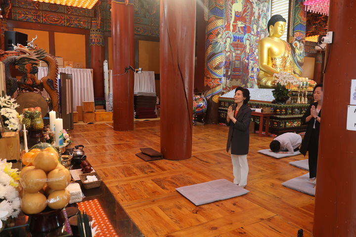 [서울=뉴시스] 고승민 기자 = 김문수 국민의힘 대선 후보의 부인 설난영 여사가 23일 강원 평창 월정사에서 합장을 하고 있다. (사진=국민의힘 제공) 2025.05.23. [email protected] *재판매 및 DB 금지