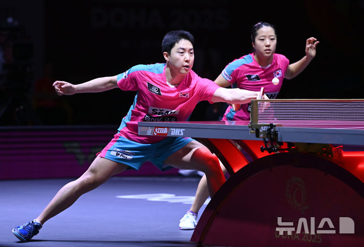 [도하(카타르)=뉴시스] 사진공동취재단 = 임종훈, 신유빈이 23일 카타르 도하 루사일 아레나에서 열린 2025 국제탁구연맹(ITTF) 세계선수권대회 혼합복식 4강 중국 쑨잉사 - 왕추친과 경기를 펼치고 있다. 2025.05.23. [email protected]