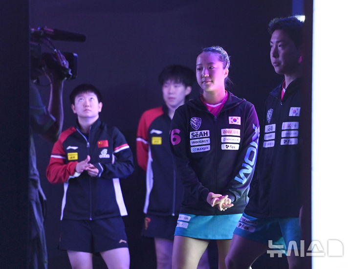 [도하(카타르)=뉴시스] 사진공동취재단 = 임종훈, 신유빈이 23일 카타르 도하 루사일 아레나에서 열린 2025 국제탁구연맹(ITTF) 세계선수권대회 혼합복식 4강 중국 쑨잉사 - 왕추친과 경기 전 입장을 기다리고 있다. 2025.05.23. [email protected]