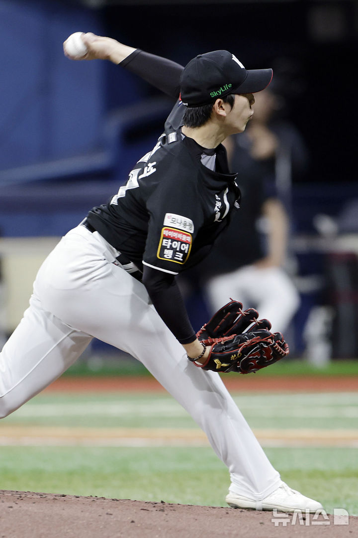 [서울=뉴시스] 최동준 기자 = 23일 서울 구로구 고척스카이돔에서 열린 2025 KBO리그 kt 위즈와 키움 히어로즈의 경기, kt 선발 오원석이 역투하고 있다. 2025.05.23. [email protected]