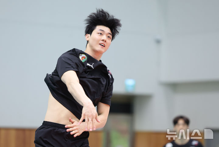 [진천=뉴시스] 황준선 기자 = 대한민국 배구 남자 국가대표팀 이우진이 23일 오후 충북 진천군 진천국가대표선수촌에서 훈련을 하고 있다. 2025.05.23. [email protected]
