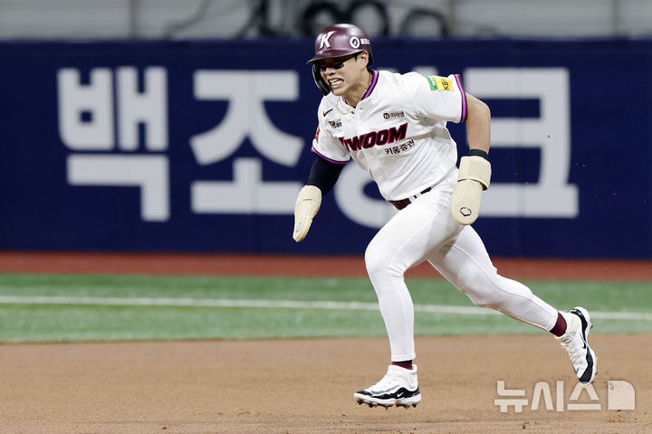 [서울=뉴시스] 최동준 기자 = 23일 서울 구로구 고척스카이돔에서 열린 2025 KBO리그 kt 위즈와 키움 히어로즈의 경기, 1회말 키움 송성문이 이형종의 타구 때 2루로 달리고 있다. 2025.05.23. [email protected]