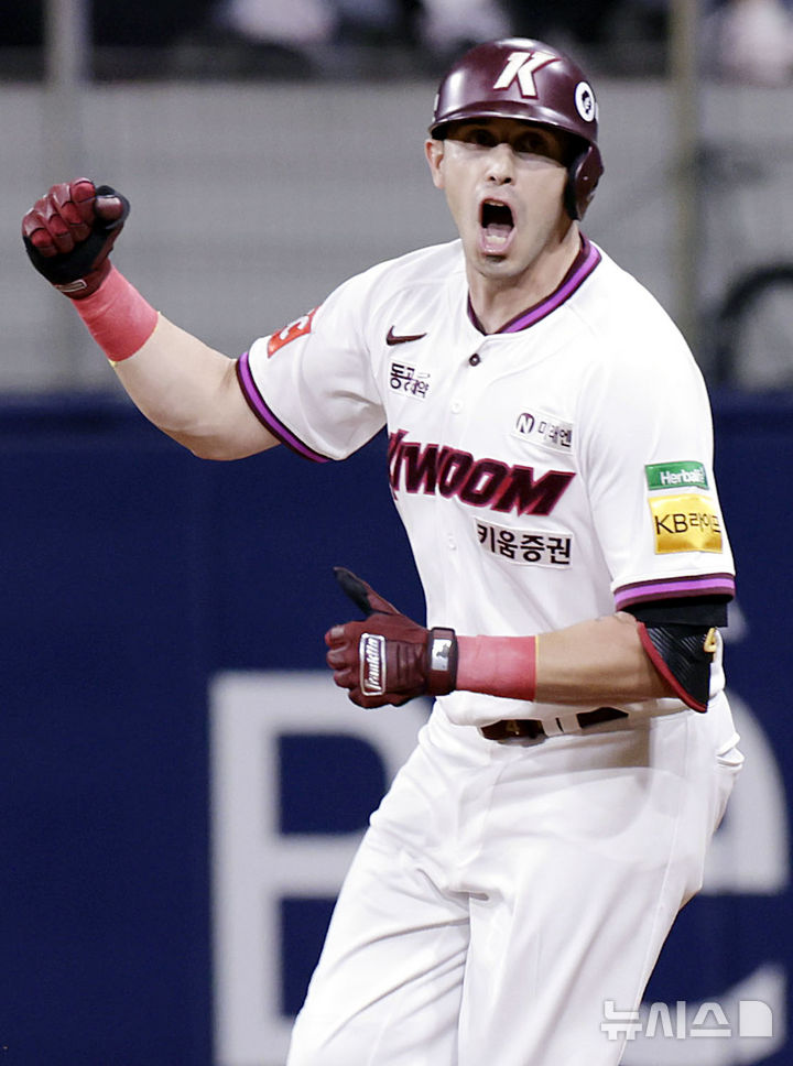 [서울=뉴시스] 최동준 기자 = 23일 서울 구로구 고척스카이돔에서 열린 2025 KBO리그 kt 위즈와 키움 히어로즈의 경기, 4회말 무사 1루 상황 키움 카디네스가 2점 홈런을 친 뒤 기뻐하고 있다. 2025.05.23. [email protected]