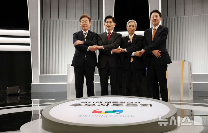 [서울=뉴시스] 국회사진기자단 = 23일 서울 영등포구 KBS본관 스튜디오에서 열린 중앙선거방송토론위원회 주관 제21대 대통령선거 2차 후보자 토론회 시작에 앞서 각 정당 대선후보들이 기념촬영을 하고 있다. 왼쪽부터 이재명 더불어민주당, 김문수 국민의힘, 권영국 민주노동당, 이준석 개혁신당 대선후보. 2025.05.23. [email protected]