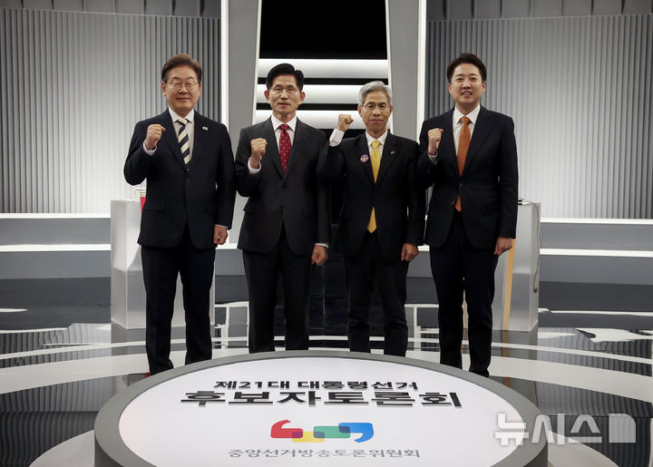 [서울=뉴시스] 국회사진기자단 = 23일 서울 영등포구 KBS본관 스튜디오에서 열린 중앙선거방송토론위원회 주관 제21대 대통령선거 2차 후보자 토론회 시작에 앞서 각 정당 대선후보들이 기념촬영을 하고 있다. 왼쪽부터 이재명 더불어민주당, 김문수 국민의힘, 권영국 민주노동당, 이준석 개혁신당 대선후보. 2025.05.23. [email protected]