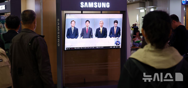 [서울=뉴시스] 박주성 기자 = 중앙선거방송토론위원회 주관 제21대 대통령선거 2차 후보자 토론회가 열린 23일 서울역 대합실에서 시민들이 토론회를 시청하고 있다. 2025.05.23. [email protected]
