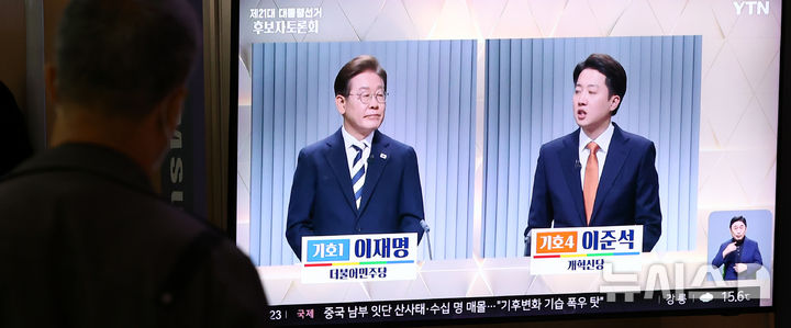 [서울=뉴시스] 박주성 기자 = 중앙선거방송토론위원회 주관 제21대 대통령선거 2차 후보자 토론회가 열린 23일 서울역 대합실에서 시민이 토론회를 시청하고 있다. 2025.05.23. [email protected]