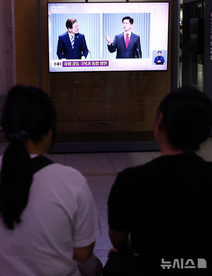 [서울=뉴시스] 박주성 기자 = 중앙선거방송토론위원회 주관 제21대 대통령선거 2차 후보자 토론회가 열린 23일 서울역 대합실에서 시민들이 토론회를 시청하고 있다. 2025.05.23. [email protected]