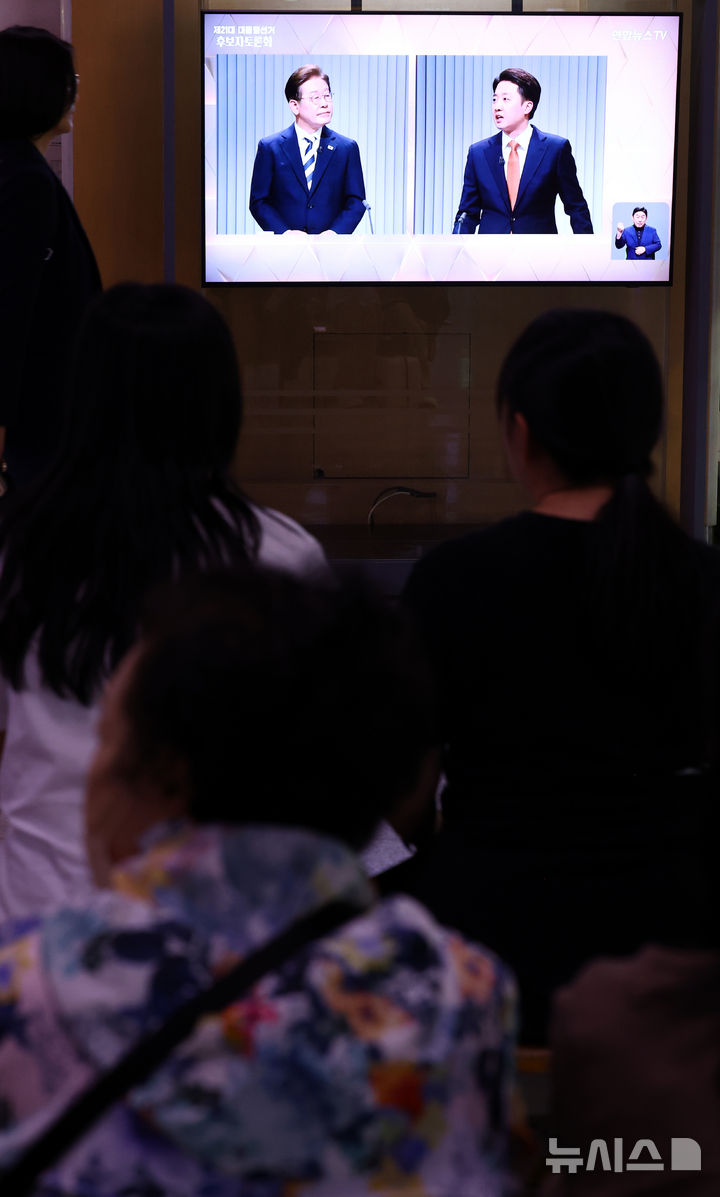 [서울=뉴시스] 박주성 기자 = 중앙선거방송토론위원회 주관 제21대 대통령선거 2차 후보자 토론회가 열린 23일 서울역 대합실에서 시민들이 토론회를 시청하고 있다. 2025.05.23. [email protected]