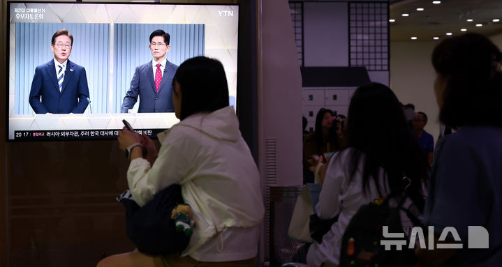 [서울=뉴시스] 박주성 기자 = 중앙선거방송토론위원회 주관 제21대 대통령선거 2차 후보자 토론회가 열린 23일 서울역 대합실에서 시민들이 토론회를 시청하고 있다. 2025.05.23. [email protected]