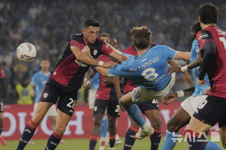 [나폴리=AP/뉴시스] 나폴리의 스콧 맥토미니가 23일(현지 시간) 이탈리아 나폴리의 디에고 아르만도 마라도나 스타디움에서 열린 2024-25 세리에A 최종 38라운드 칼리아리와의 경기 전반 42분 바이시클킥으로 선제골을 넣고 있다. 안토니오 콘테 감독이 이끄는 나폴리는 2-0으로 완승하며 2년 만에 리그 정상에 다시 올랐다. 2025.05.24.