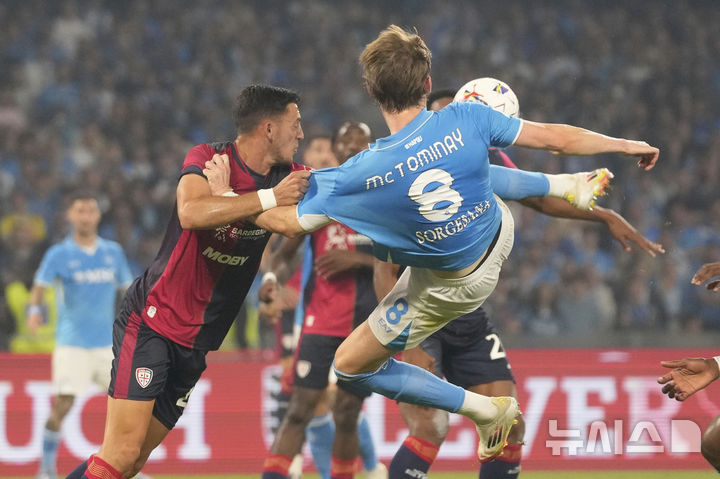 [나폴리=AP/뉴시스] 나폴리의 스콧 맥토미니가 23일(현지 시간) 이탈리아 나폴리의 디에고 아르만도 마라도나 스타디움에서 열린 2024-25 세리에A 최종 38라운드 칼리아리와의 경기 전반 42분 바이시클킥으로 선제골을 넣고 있다. 안토니오 콘테 감독이 이끄는 나폴리는 2-0으로 완승하며 2년 만에 리그 정상에 다시 올랐다. 2025.05.24.