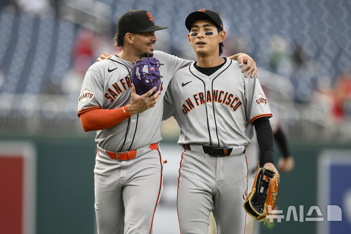 [워싱턴=AP/뉴시스] 샌프란시스코 자이언츠의 이정후(오른쪽)가 23일(현지 시간) 워싱턴 내셔널스 파크에서 열리는 2025 메이저리그 워싱턴 내셔널스와의 경기를 앞두고 윌리 아다메스와 더그아웃으로 향하며 얘기를 나누고 있다. 이정후는 3타수 2안타 2득점 1볼넷을 기록했고 팀은 4-0으로 승리했다. 2025.05.24.