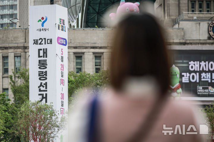 [서울=뉴시스] 정병혁 기자 = 제21대 대통령 선거가 열흘 앞으로 다가온 24일 서울 중구 서울광장에 설치된 투표독려 조형물 앞에서 시민들이 이동하고 있다. 2025.05.24. [email protected]