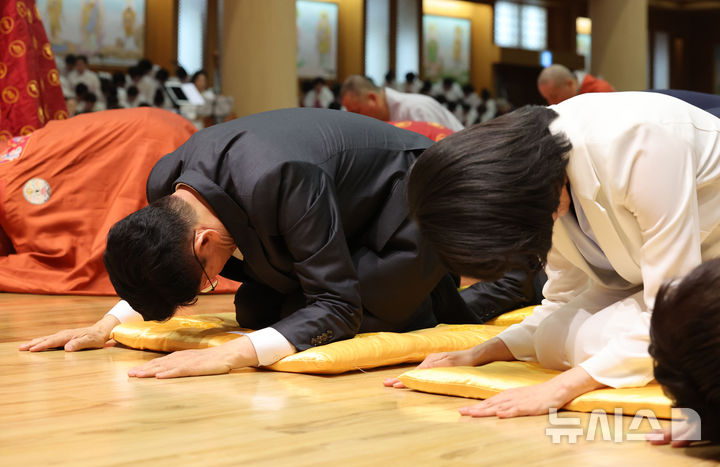 [단양=뉴시스] 권창회 기자 =김문수 국민의힘 대선 후보와 이재명 더불어민주당 대선후보 배우자 김혜경 여사가 24일 충북 단양군 구인사에서 열린 상월원각대조사 제51주기 열반대제에 참석해 절하고 있다. 2025.05.24. [email protected]