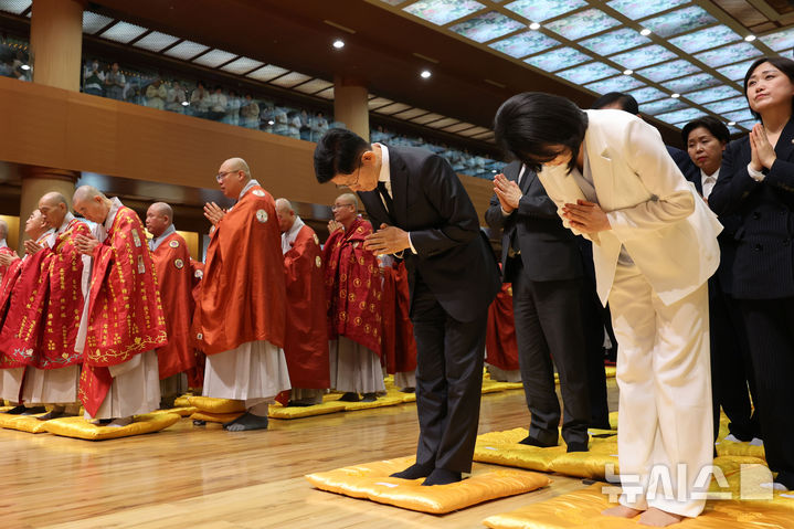 [단양=뉴시스] 권창회 기자 =김문수 국민의힘 대선 후보와 이재명 더불어민주당 대선후보 배우자 김혜경 여사가 24일 충북 단양군 구인사에서 열린 상월원각대조사 제51주기 열반대제에 참석해 합장을 하고 있다. 2025.05.24. [email protected]