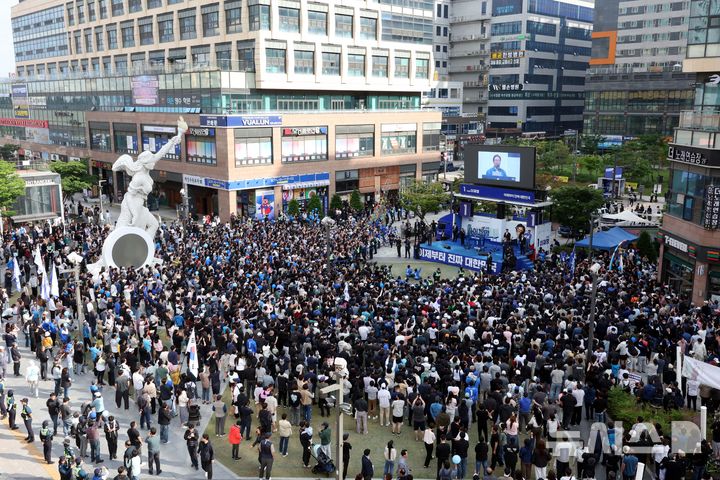 [시흥=뉴시스] 조성봉 기자 = 이재명 더불어민주당 대선 후보가 24일 경기 시흥 배곧아브뉴프랑 센트럴광장에서 열린 유세에서 시민들에게 지지를 호소하고 있다. [email protected]