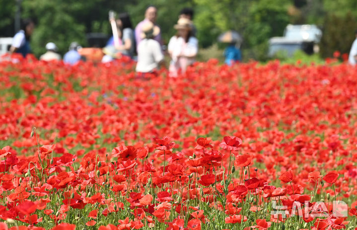[수원=뉴시스] 김종택 기자 = 화창한 날씨를 보인 25일 경기 수원시 권선구 탑동 시민농장을 찾은 시민들이 붉게 물든 양귀비꽃을 바라보며 꽃놀이를 즐기고 있다. 2025.05.25. [email protected]