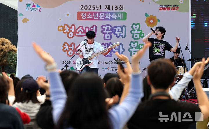 [대구=뉴시스] 이무열 기자 = 25일 대구 중구 2.28기념중앙공원에서 열린 제13회 청소년문화축제에서 헤이맨 밴드가 공연을 선보이고 있다. 2025.05.25. [email protected]