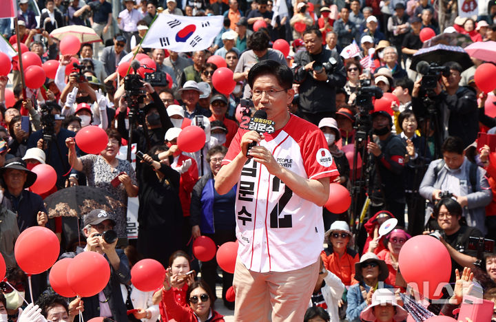 [보령=뉴시스] 권창회 기자 = 김문수 국민의힘 대선 후보가 25일 오전 충남 보령군 대천역 광장에서 열린 집중유세에서 지지호소를 하고 있다. (공동취재) 2025.05.25. [email protected]