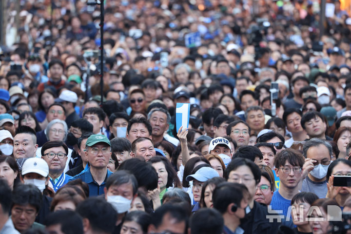 [천안=뉴시스] 조성봉 기자 = 이재명 더불어민주당 대통령 후보가 캐스팅보트인 충청권 공략에 나선 25일 오후 충남 천안시 신부문화거리에서 시민들이 이 후보 연설을 듣고 있다.(공동취재) 202.5.05.25. [email protected]