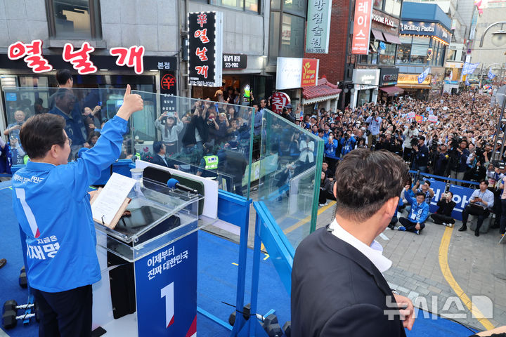 [천안=뉴시스] 조성봉 기자 = 이재명 더불어민주당 대선 후보가 25일 충남 천안시 동남구 천안 신부문화거리에서 열린 유세에서 시민들에게 지지를 호소하고 있다. (공동취재) 2025.05.25. [email protected]
