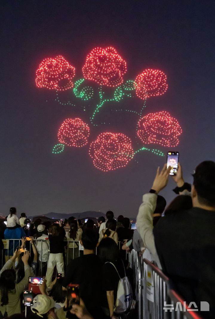[서울=뉴시스] 김선웅 기자 = 25일 서울 광진구 뚝섬한강공원에서 2025 한강 드론 라이트 쇼 특별 공연이 펼쳐지고 있다. 2025.05.25. [email protected]