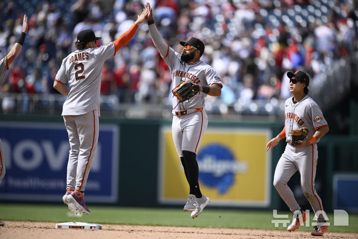 [워싱턴=AP/뉴시스] 샌프란시스코 자이언츠의 이정후(오른쪽)가 25일(현지 시간) 워싱턴 내셔널스 파크에서 열린 2025 메이저리그 워싱턴 내셔널스와의 경기를 승리로 마친 후 동료들과 자축하고 있다. 이정후는 이날 4타수 1안타로 6경기 연속 안타를 기록했고 팀은 3-2로 승리했다. 2025.05.25.