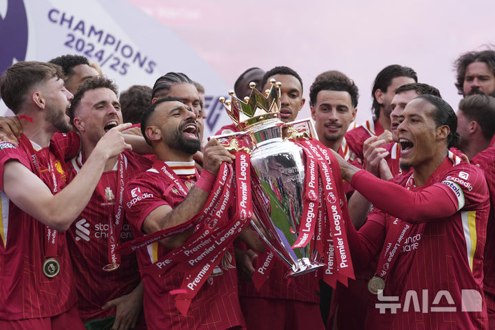 [리버풀=AP/뉴시스] 리버풀 선수들이 25일(현지 시간) 영국 리버풀의 안필드 스타디움에서 열린 2024-25 프리미어리그 최종 38라운드 크리스털 팰리스와의 경기를 마친 후 우승컵을 들고 환호하고 있다. 조기에 우승을 확정했던 리버풀은 이날 1-1로 비겼으며 모하메드 살라는 득점(29골)과 도움(18도움) 2관왕에 올랐다. 2025.05.26.