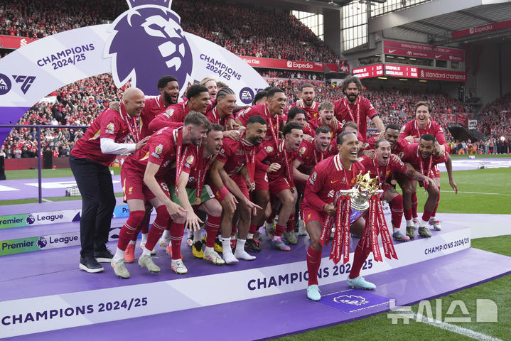 [리버풀=AP/뉴시스] 리버풀 선수들이 25일(현지 시간) 영국 리버풀의 안필드 스타디움에서 열린 2024-25 프리미어리그 최종 38라운드 크리스털 팰리스와의 경기를 마친 후 우승컵을 들고 환호하고 있다. 조기에 우승을 확정했던 리버풀은 이날 1-1로 비겼으며 모하메드 살라는 득점(29골)과 도움(18도움) 2관왕에 올랐다. 2025.05.26.