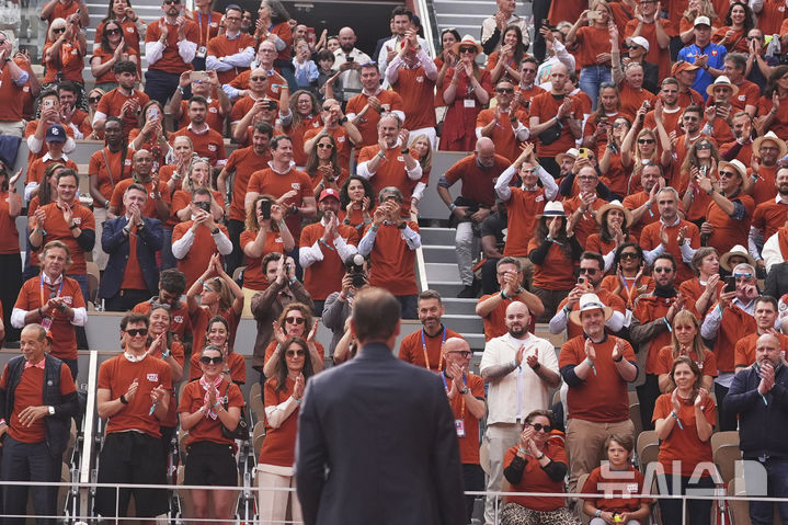 [파리=AP/뉴시스] 25일(현지 시간) 프랑스 파리 롤랑가로스의 메인 코트 필리프 샤트리에 센터 코트에서 라파엘 나달의 은퇴식이 열려 팬들이 나달에게 경의를 표하고 있다. 나달은 클레이코트인 프랑스오픈에서 14회 우승하며 '흙신'으로 불렸다. 2025.05.26.