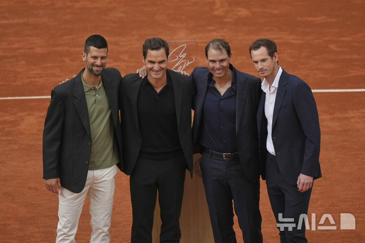 [파리=AP/뉴시스] 25일(현지 시간) 프랑스 파리 롤랑가로스의 메인 코트 필리프 샤트리에 센터 코트에서 라파엘 나달의 은퇴식이 열려 이른바 '빅4'가 기념 촬영을 하고 있다. 왼쪽부터 노바크 조코비치, 로저 페더러, 라파엘 나달, 앤디 머리. 나달은 클레이코트인 프랑스오픈에서 14회 우승하며 '흙신'으로 불렸다. 2025.05.26.