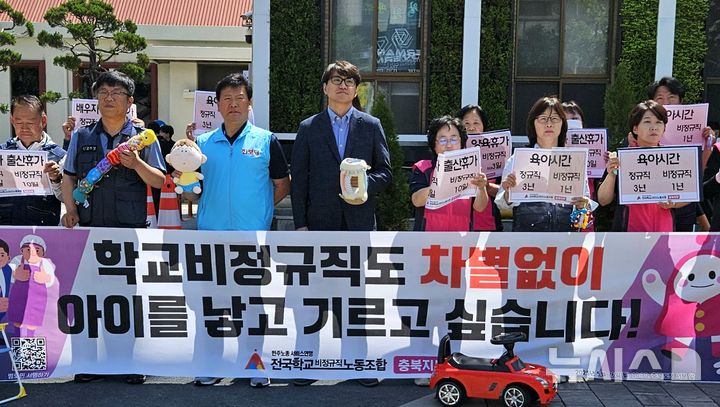 [청주=뉴시스] 이도근 기자= 전국학교비정규직노동조합 충북지부 노조원들이 26일 청주시 상당구 문화동 충북도청 앞에서 기자회견을 열어 "도와 도의회는 학교 비정규직 노동자에 대한 출산·육아 차별 해소 대책을 마련하라"고 촉구하고 있다. 2025.05.26. [email protected]