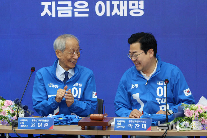 [서울=뉴시스] 조성우 기자 = 윤여준(왼쪽), 박찬대 더불어민주당 상임총괄선거대책위원장이 26일 오전 서울 여의도 중앙당사에서 열린 중앙선거대책위원회의에서 대화하고 있다. 2025.05.26. [email protected]
