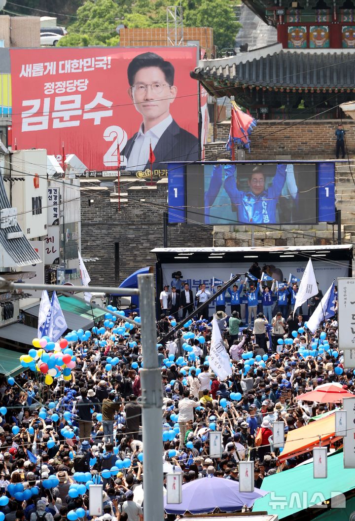 [수원=뉴시스] 조성봉 기자 = 이재명 더불어민주당 대선 후보가 26일 경기 수원시 팔달문 영동시장 입구에서 집중유세를 하고 있는 가운데 김문수 국민의힘 대선후보의 대형 현수막이 눈에 띄고 있다. 2025.05.26. [email protected]