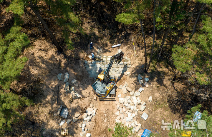 [대구=뉴시스] 이무열 기자 = 26일 산불이 발생했던 대구 북구 함지산에서 작업자들이 여름 장마철 산사태 예방을 위한 골막이를 설치하고 있다. 2025.05.26. [email protected]