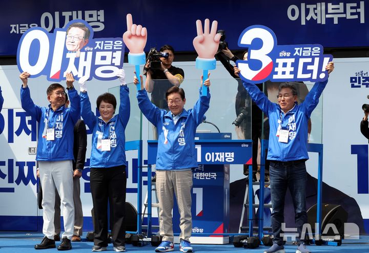 [용인=뉴시스] 조성봉 기자 = 이재명(왼쪽 세번째) 더불어민주당 대선 후보를 비롯한 의원들이 26일 경기 용인시 수지구 단국대 죽전캠퍼스 정문에서 열린 유세에서 시민들에게 투표를 독려하는 퍼포헌스를 하고 있다. 2025.05.26. [email protected]
