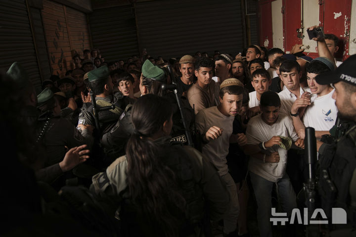 [예루살렘=AP/뉴시스] 26일(현지 시간) 예루살렘 구시가지에서 열린 '예루살렘의 날' 행진 도중 이스라엘 경찰이 이스라엘 청년들과 충돌하고 있다. 올해로 58주년을 맞은 '예루살렘의 날'은 1967년 이스라엘이 일으킨 중동전쟁에서 이스라엘이 서안지구, 가자지구를 점령하고 동예루살렘까지 점령한 것을 기념하는 국경일이다. 2025.05.26.