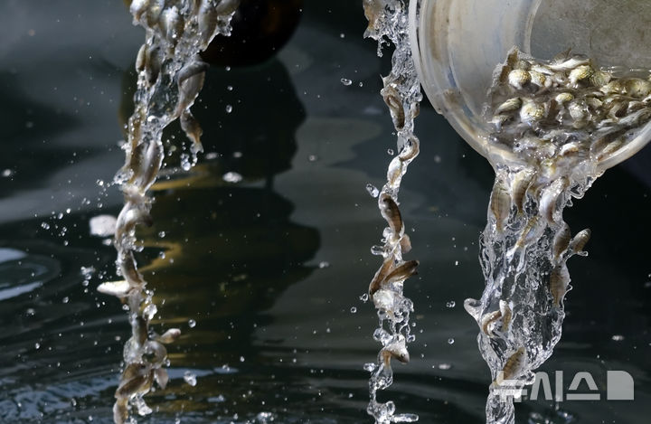 [부산=뉴시스] 하경민 기자 = 부산시 수산자원연구소 관계자들이 27일 부산 사하구 낫개방파제 앞 바다에서 어린 감성돔을 방류하고 있다.