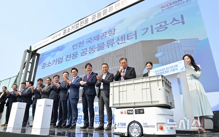 [인천=뉴시스] 김선웅 기자 = 이학재(왼쪽 다섯 번째) 인천국제공항공사 사장과 강석진(왼쪽 여섯 번째) 중소벤처기업진흥공단 이사장을 비롯한 내빈들이 27일 오후 인천국제공항 제2공항물류단지 내 공동물류센터 현장에서 열린 중소기업전용 공동물류센터 건설사업 기공식에서 물류로봇을 살펴보고 있다. (공동취재) 2025.05.27. [email protected]