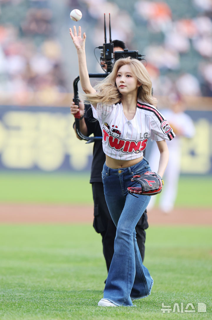 [서울=뉴시스] 이영환 기자 = 27일 오후 서울 송파구 잠실야구장에서 열린 2025 프로야구 한화 이글스와 LG 트윈스의 경기, 그룹 아이브(IVE) 가을이 시구를 하고 있다. 2025.05.27. [email protected]