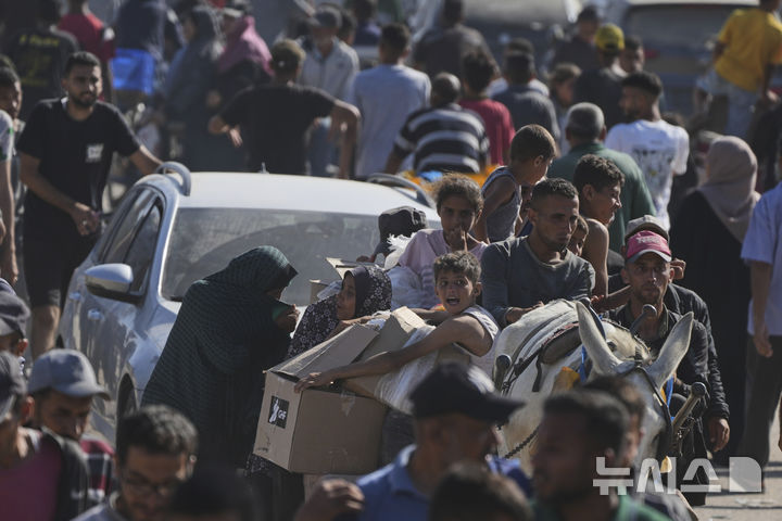 [라파=AP/뉴시스] 27일(현지 시간) 가자지구 남부 라파에서 팔레스타인 주민들이 미국과 이스라엘이 주도하는 지원 단체 '가자 인도주의 재단'(GHF)으로부터 식량과 인도적 지원 물품을 받으려 몰려들고 있다. 이날 배급소에 팔레스타인 주민 수십만 명이 몰려들면서 현장은 아수라장이 되기도 했다. 2025.05.28.