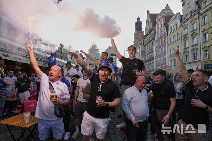 [브로츠와프=AP/뉴시스] 폴란드 브로츠와프 시립경기장에서 열리는 2024-25 유럽축구연맹(UEFA) 콘퍼런스리그(UECL) 첼시(영국)와 레알 베티스(스페인)의 결승전을 하루 앞둔 27일(현지 시간) 첼시 팬들이 연막을 터트리며 응원하고 있다. 첼시는 UEFA 주관 모든 대회 석권에 도전하며 베티스는 구단 역사상 첫 UEFA 주관 대회 결승전에 나선다. 2025.05.28.